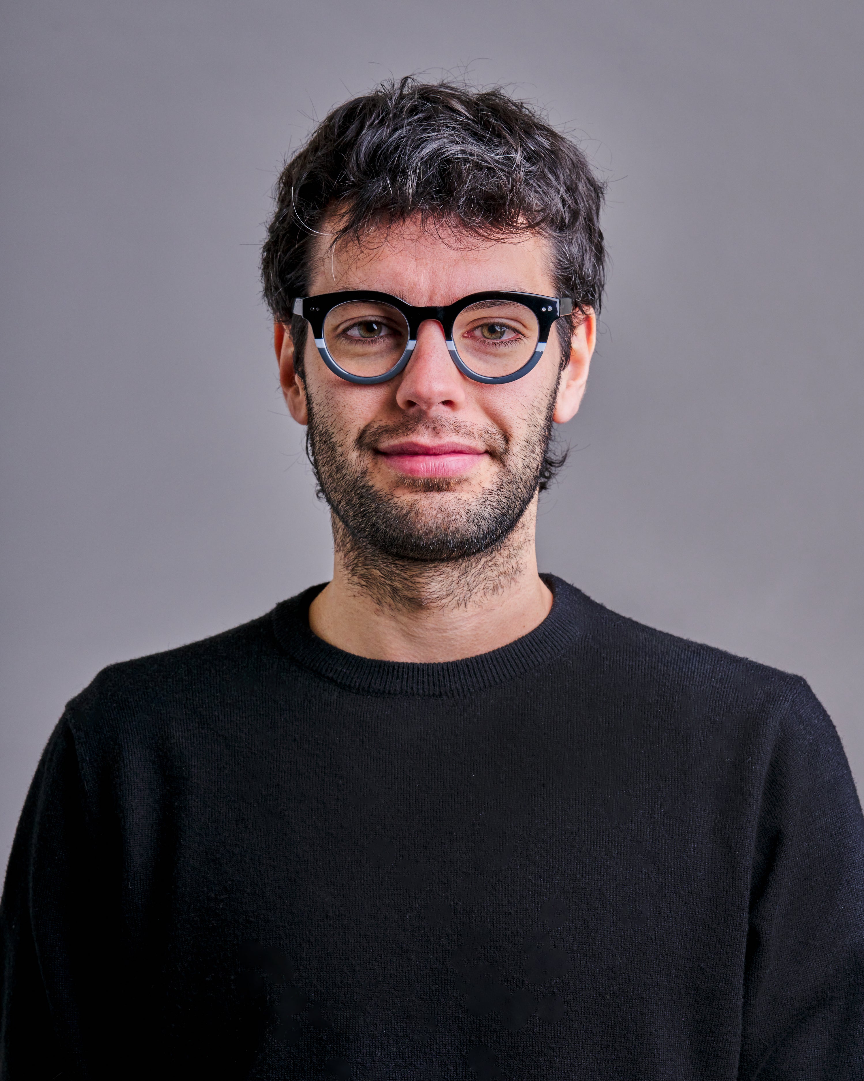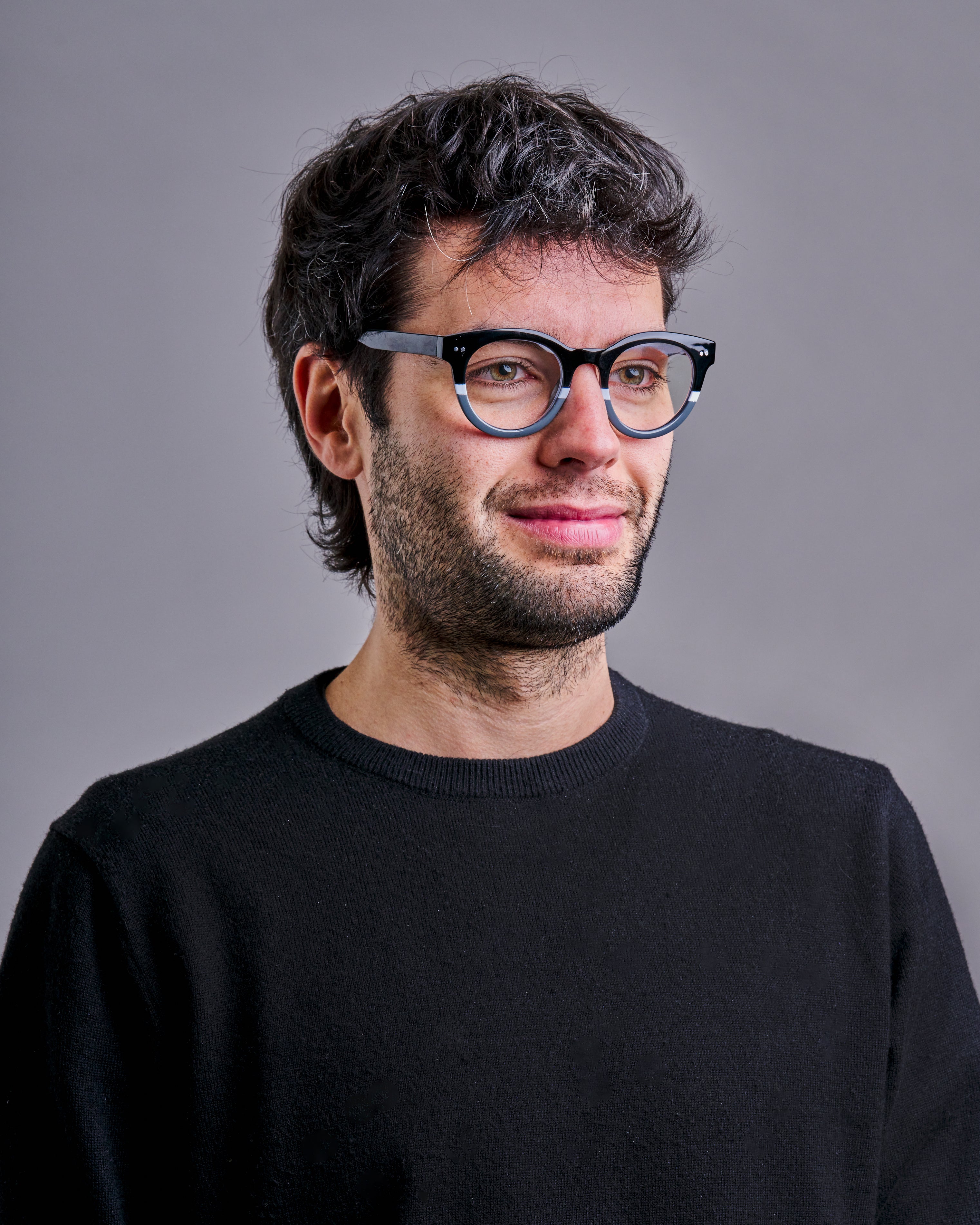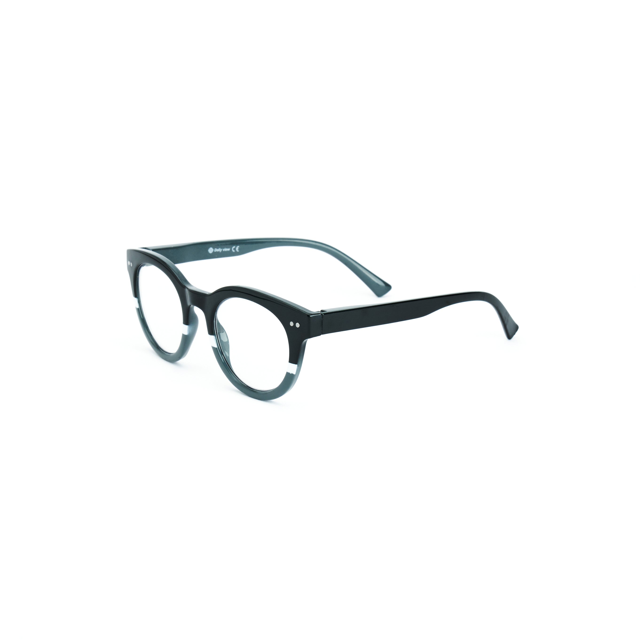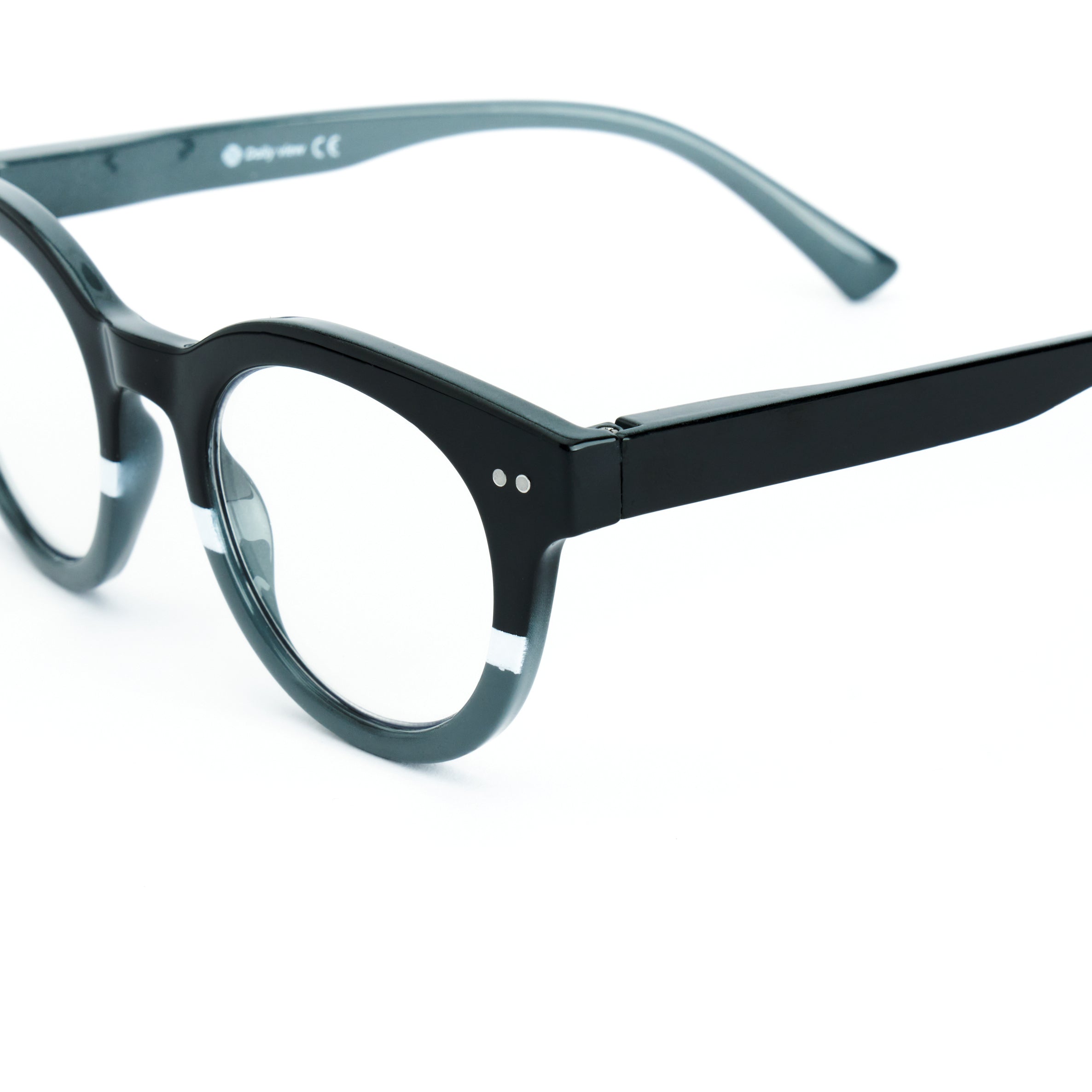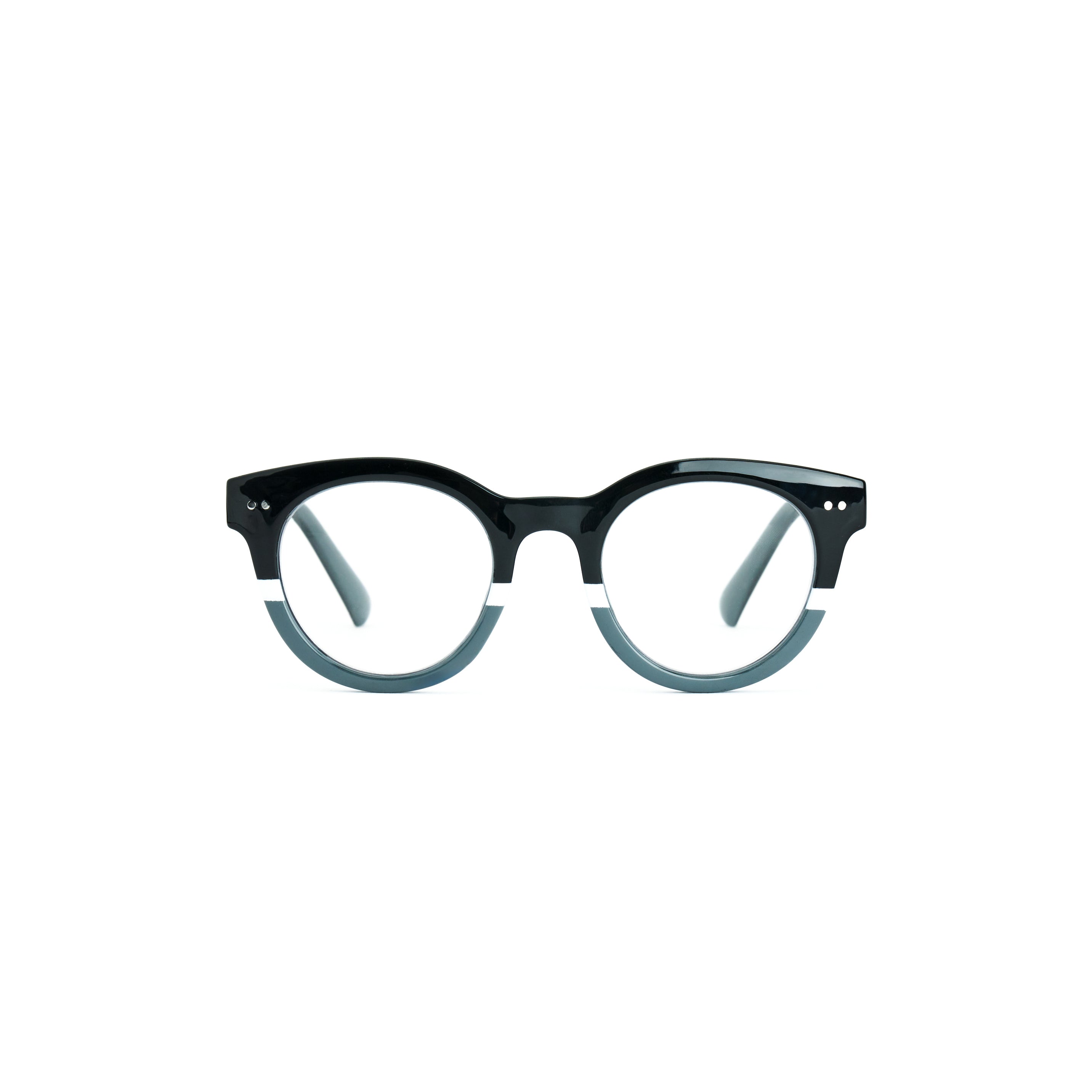 La montatura circolare valorizza il viso con uno stile essenziale ed elegante. Il colore nero lucido sfumato verso il grigio trasparente, arricchito da dettagli metallici, conferisce un look sobrio e ricercato.