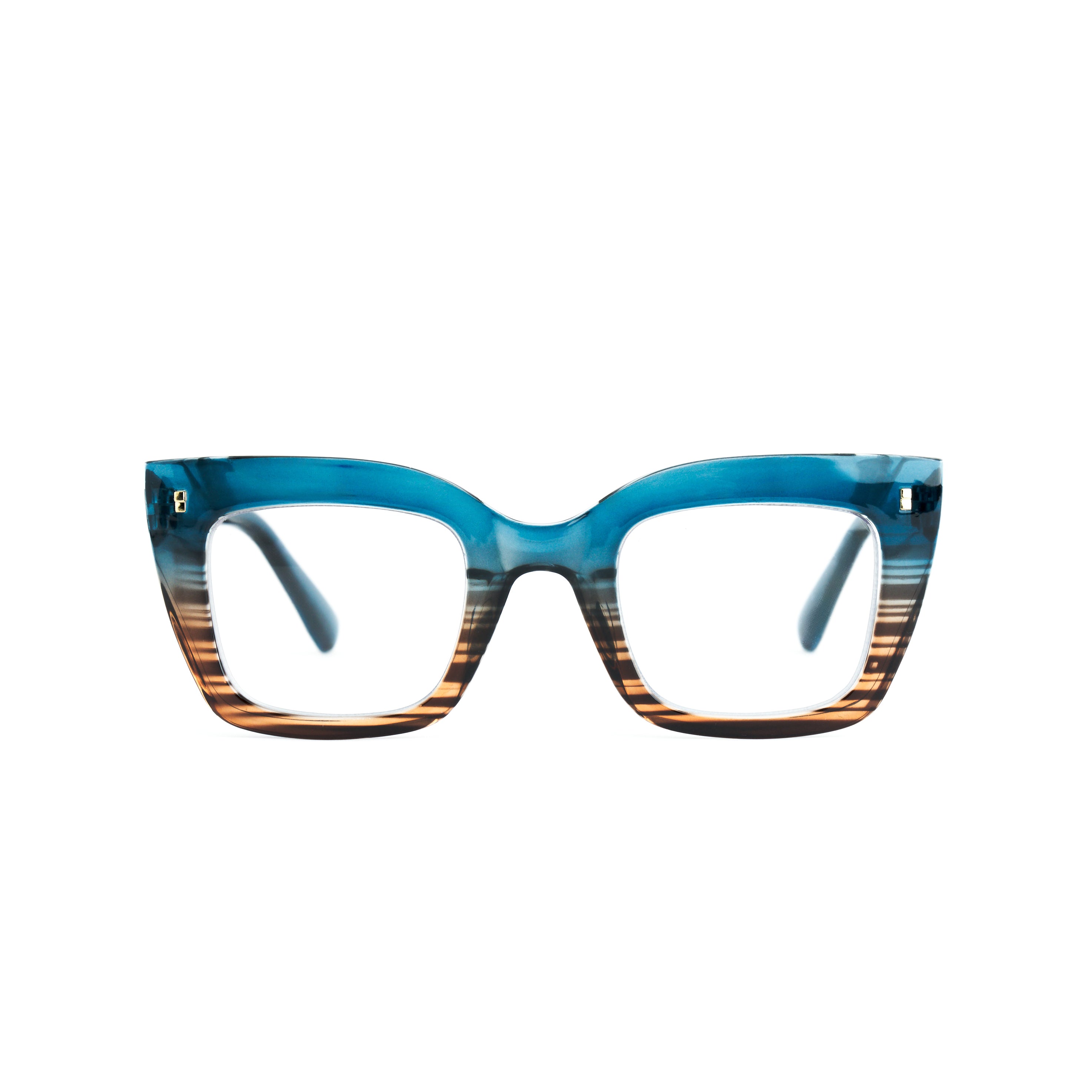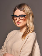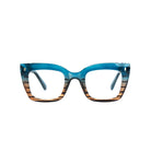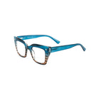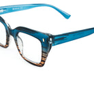 La montatura si distingue per l’originale sfumatura blu petrolio con righe avana, perfetta per chi ama accessori dal forte impatto visivo e dallo stile contemporaneo.