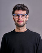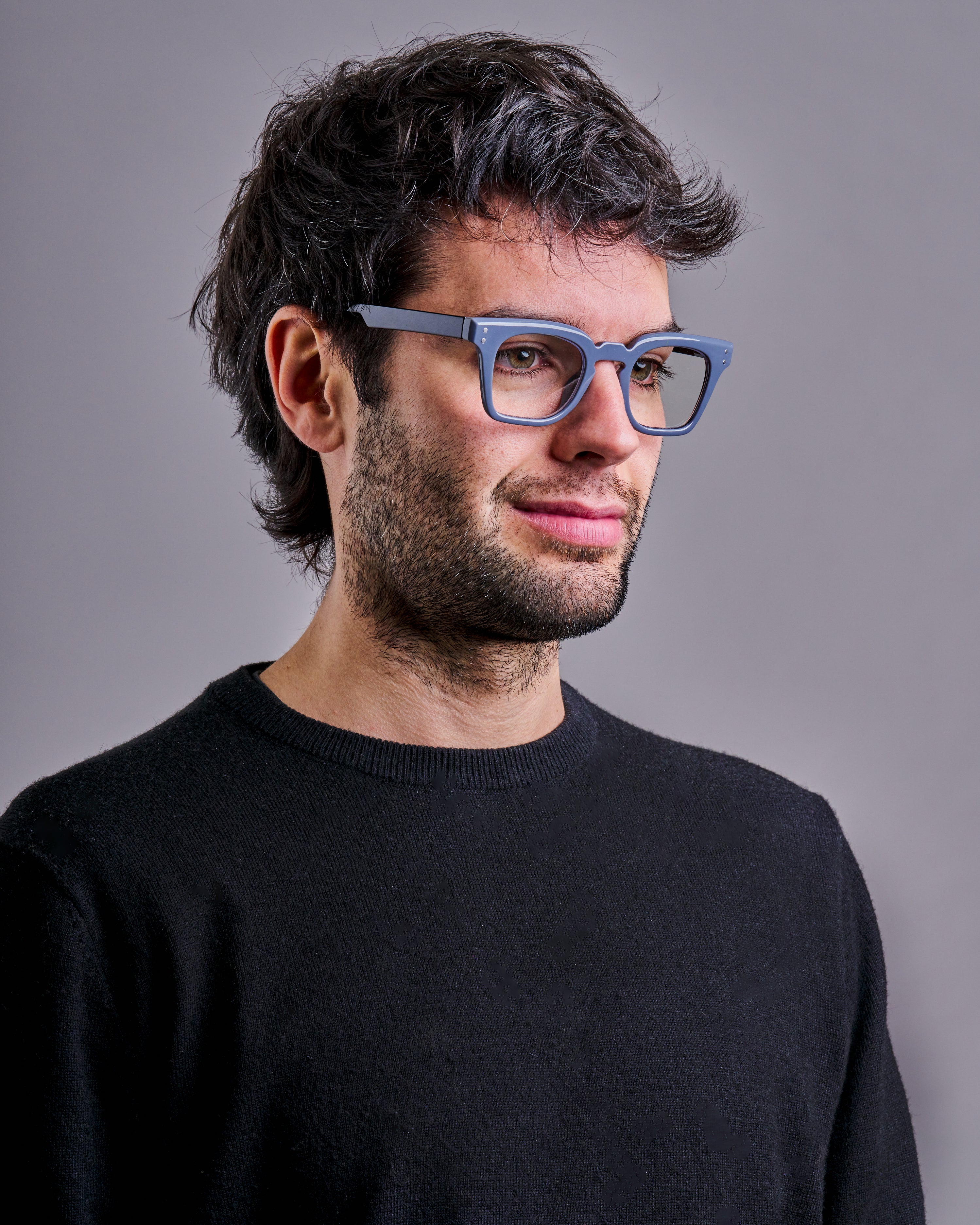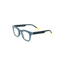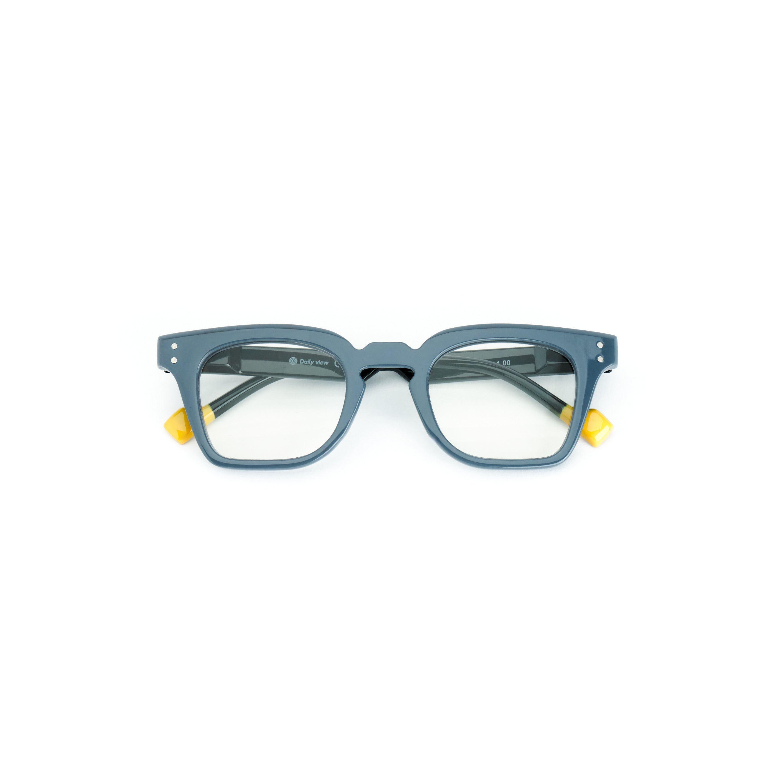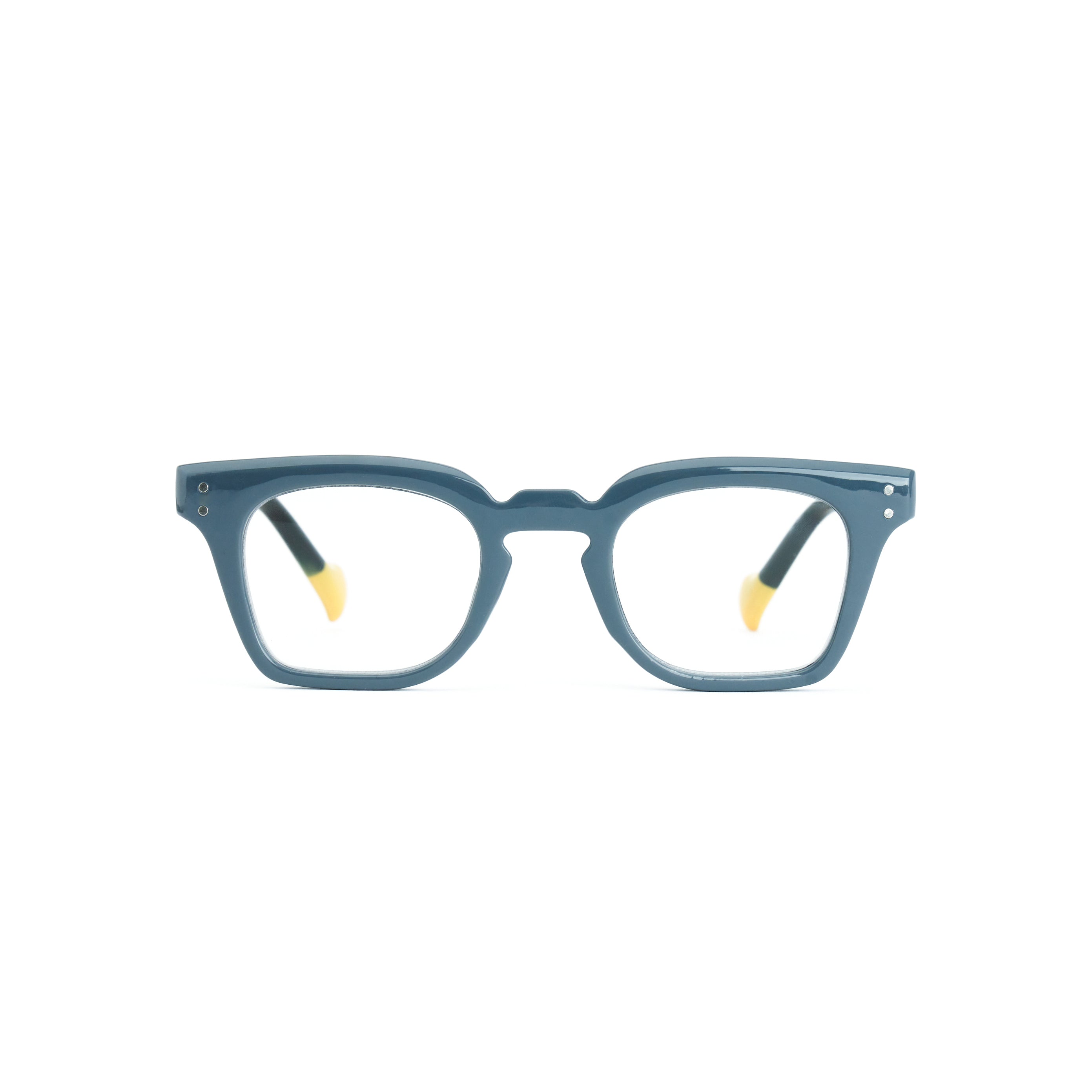 Il frontale quadrato, dalle linee pulite, valorizza i lineamenti con uno stile contemporaneo. La montatura in acetato grigio-blu opaco, completata dal dettaglio giallo a contrasto sulle punte delle aste, dona un tocco di colore e originalità.